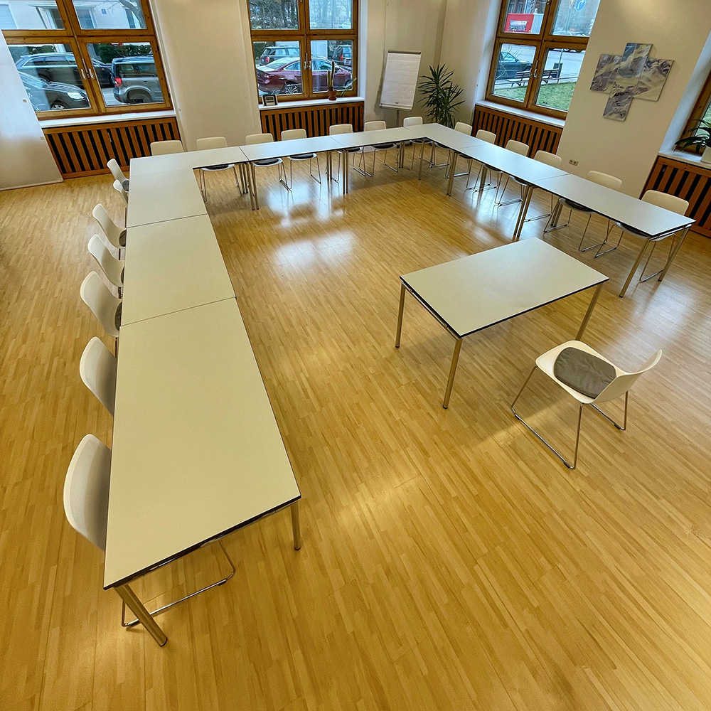 - Seminarbestuhlung mit Tischen (z.B. Tischblöcke) für max. 20 Personen